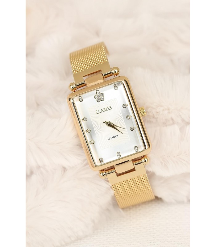Yeni sezona, taşlı taşlı çiçek detaylı Gold Renk Hasır Metal Kordonlu Dikdörtgen Vintage Kasa Clsriss Bayan Saat ile giriş yapın.