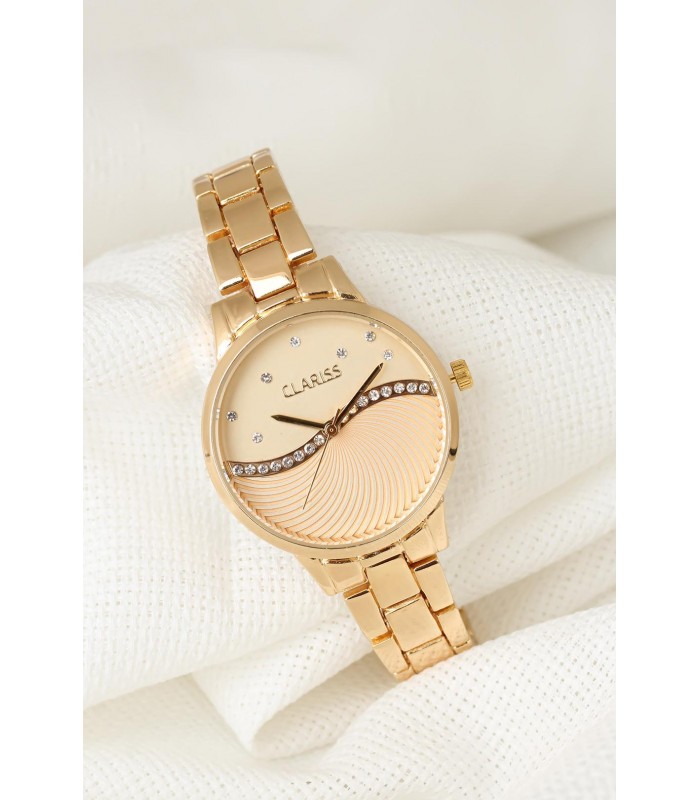 Gold Renk Metal Kordonlu Sarı Renk Zirkon Taşlı İç Tasarımlı Clariss Marka Bayan Kol Saati
