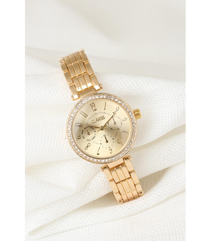 Gold Renk Metal Kordonlu Zirkon Taşlı Kasa Clariss Marka Bayan Kol Saati