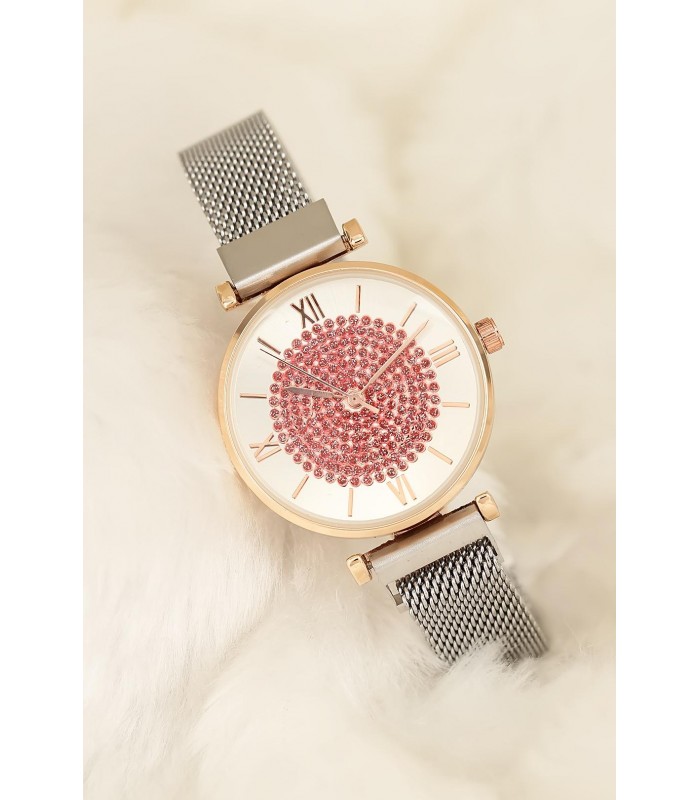 Rose renk metal kasalı Mıknatıslı Hasır Metal Silver Renk Kordonlu Taşlı İç Tasarımlı Bayan Saat  ile farkınızı yansıtın.