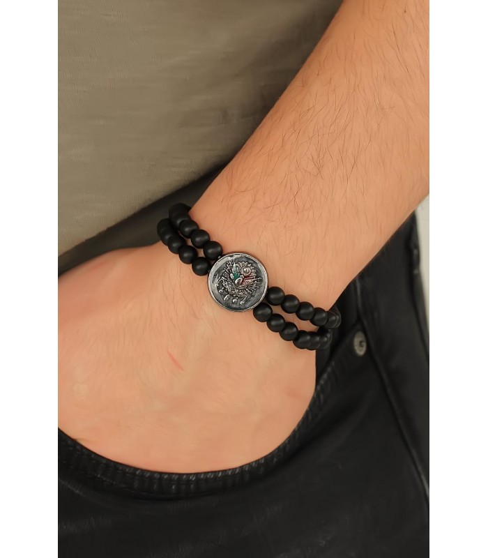 Osmanlı Armalı Metal Aksesuarlı Siyah Oniks Doğal Taş Erkek Bileklik