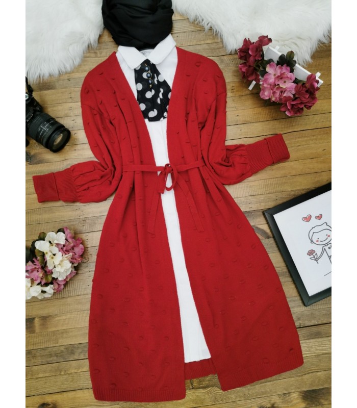 Ponponlu Kemerli Hırka -Kırmızı