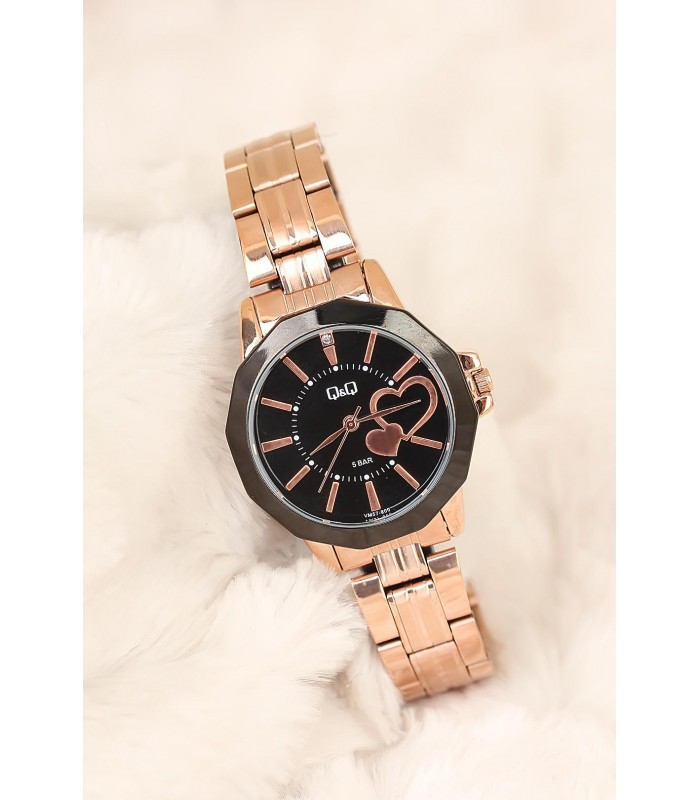Q&Q Marka Rose Kaplama Metal Kordonlu Kalpli Kasa 2 Yıl Garantili Bayan Kol Saati