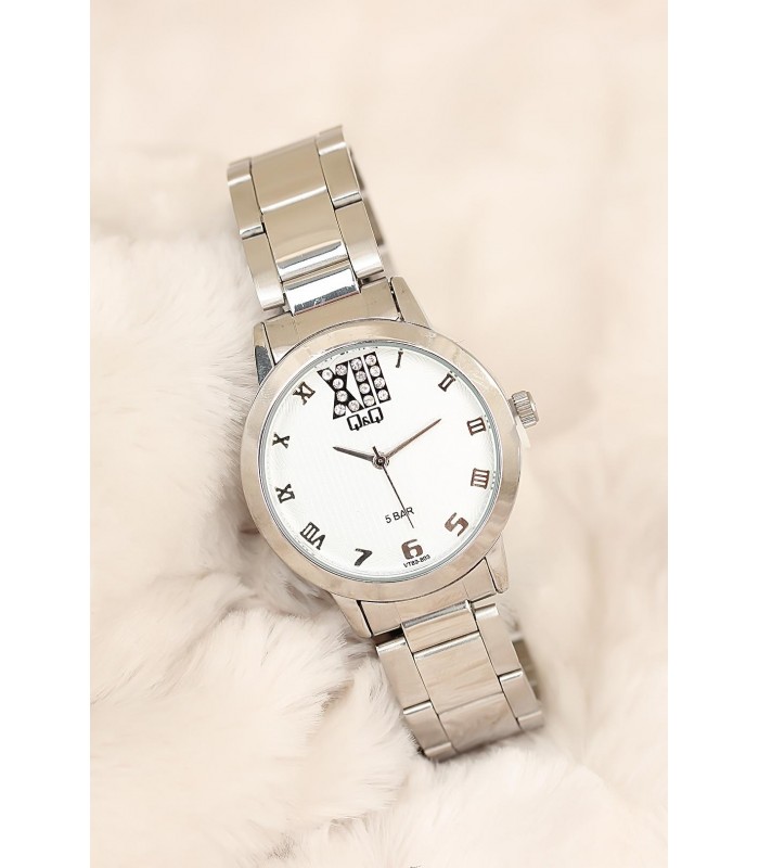 Q&Q Marka Silver Kaplama Metal Kordonlu Spor Kasa Taşlı Tasarım 2 Yıl Garantili Bayan Kol Saati