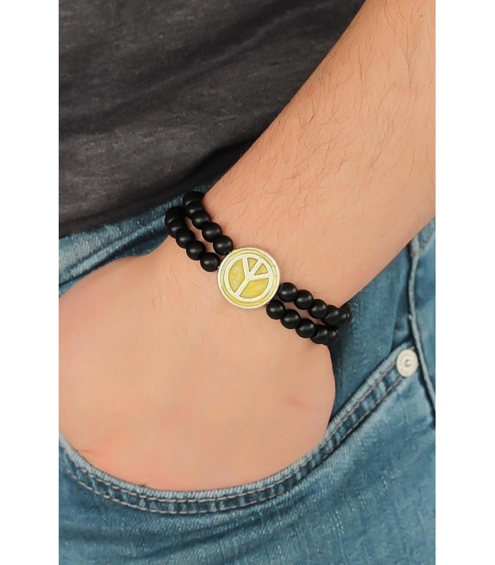 Günlük kombinlerinizi Sarı Metal Barış Simgesi Tasarımlı Siyah Renk Mat Oniks Doğal Taş Erkek Bileklik ile detaylandırın.