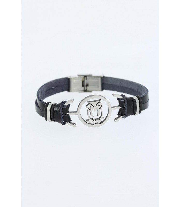 Silver Renk Baykuş Figürlü Metal Aksesuarlı Siyah Renk Deri Erkek Bileklik
