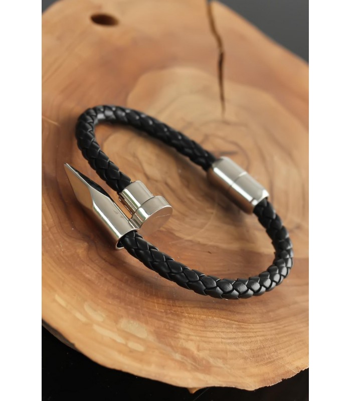 Silver Renk Çivi Uçlu Siyah Renk Erkek Deri Bileklik