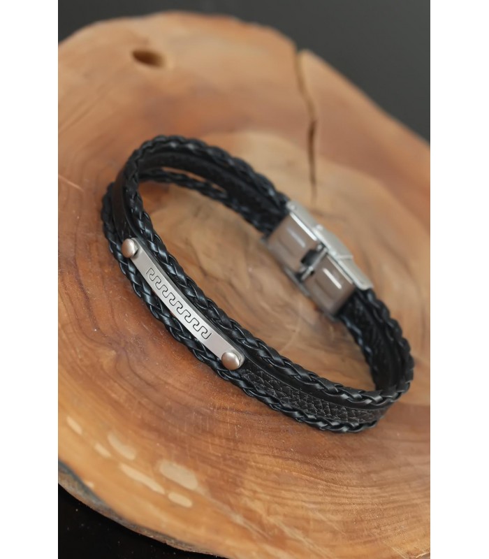Silver Renk Metal Aksesuarlı Siyah Erkek Deri Bileklik