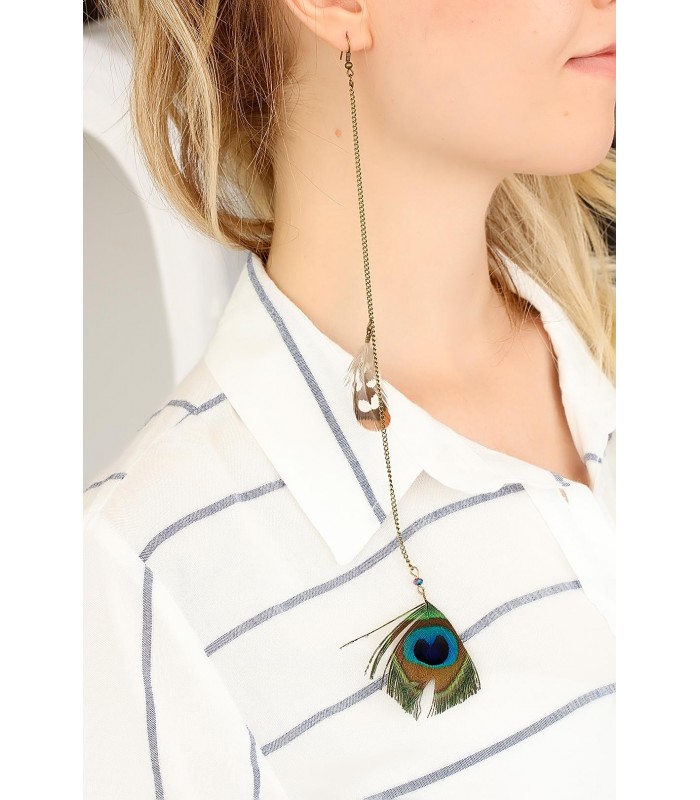Trend tavuş kuşu Tüy Tasarımlı eskitme renk uzun zincirli Bayan Küpe