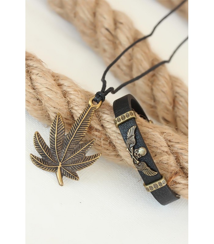 Yapraklı Kolye Ve Kuru Kafalı Deri Bileklik Kombini