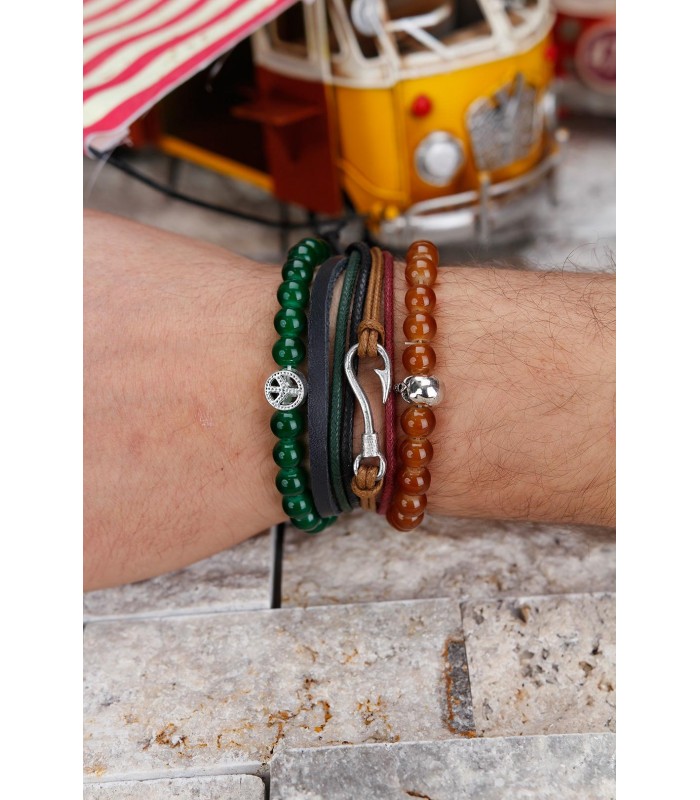 Yeşil Ve Kahverengi İpli Deri Erkek Bileklik Kombini