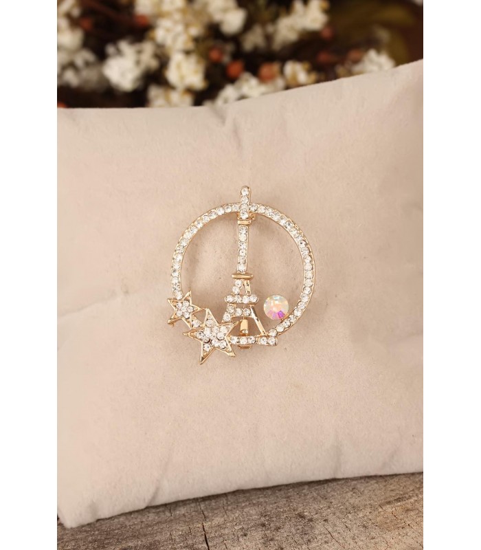 Dore renk kaplama metal tasarım Zirkon Taşlı Paris Kulesi Figürlü Broş